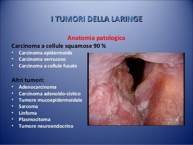 Tumore / cancro alla faringe e alla gola ona. Il cancro alla gola tumore alla faringe ha tra i suoi agenti eziologici (cause cancro in gola) l'esposizione a polveri e fibre di amianto (sinonimo asbesto), il tabacco, l'abuso di alcol, infezioni da hpv, dieta povera di ortaggi e frutta e e altri agenti cancerogeni di natura occupazionale e ambientale. Laringe tumore find laringe tumore.. Search for health results now! Browse common symptoms & effective treatments. Quando il papilloma virus colpisce il cavo orale e la laringe. A sintomatico e pericoloso, il virus del papilloma umano (hpv dall’inglese human papilloma virus) noto come causa principale del carcinoma al collo dell’utero, gioca un ruolo determinante anche nelle lesioni del cavo orale e della laringe. Oltre il 50% della popolazione ha questo virus, ma se il sistema immunitario funziona in maniera fisiologica non permette alla patologia di manifestarsi. Spinocellulare, carcinoma in "dizionario di medicina". Tumore maligno originato dall’epitelio pavimentoso di rivestimento, e in partic. Dai suoi strati intermedi e superficiali, le cui cellule appaiono, al microscopio, fornite di minuscole spine. Il carcinoma spinocellulare, carcinoma insorge nella pelle, nelle varie parti della bocca, della laringe e dell’esofago, costituisce quasi tutti i cancri della portio uterina e della vagina, molti.